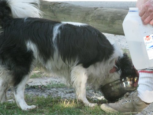 Whiskey, with his head in the water bowl: